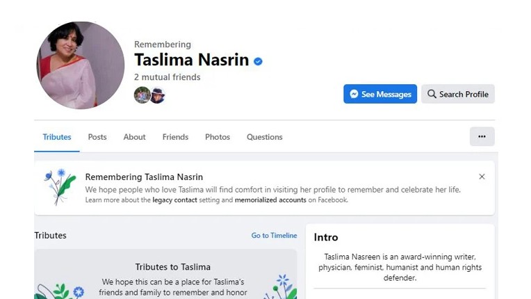 ফেসবুক কর্তৃপক্ষ তসলিমা নাসরিনের প্রোফাইলে লিখেছে- ‘আমরা আশা করি যারা তসলিমা নাসরিনকে ভালোবাসেন, তারা তাকে স্মরণ ও সম্মানিত করার জন্য তার প্রোফাইল পরিদর্শন করে সান্ত্বনা খুঁজে পাবেন।’