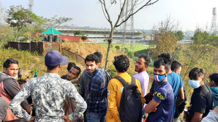 উঁচু টিলা পার হয়ে আগত সেই দর্শকদের ভিড়ে গিয়ে কথা বলে জানা যায় বেশির ভাগই সিলেটের বাসিন্দা। এ ছাড়াও সিলেটে ঘুরতে আসা অনেকেই মাঠে খেলা দেখে টিলায় এসে জড়ো হয়েছে খেলা দেখার জন্য। অনেকেই মাঠে ঢোকার জন্য আকুতি জানিয়ে বলেন- আমাদের ডাবল ডোজ টিকা নেওয়ার সার্টিফিকেট আছে। আমরা স্বাস্থ্যবিধি মেনে মাঠে প্রবেশ করতে চাচ্ছি। কিন্তু আমাদের টিকিট দিচ্ছে না। যদি আমাদের মাঠে প্রবেশের সুযোগ দেওয়া হতো তাহলে ভালো হতো।