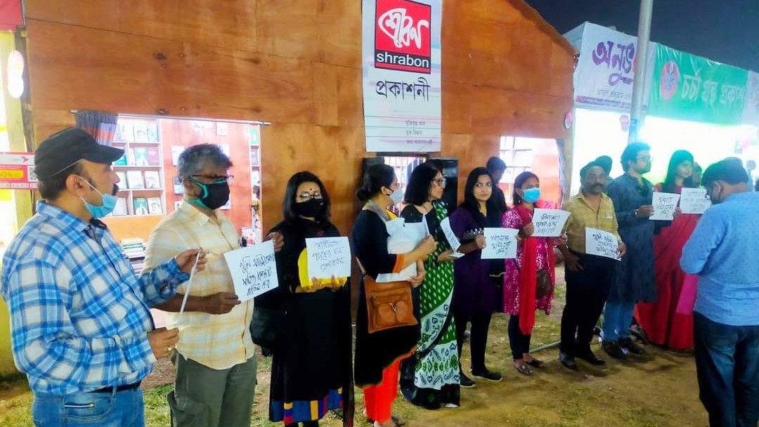 বাংলা একাডেমি আয়োজিত অমর একুশে গ্রন্থমেলার সোহরাওয়ার্দী উদ্যান অংশে শ্রাবণ প্রকাশনীর স্টলের সামনে বৃহস্পতিবার (১৭ মার্চ) রাতে এই কর্মসূচি পালন করেন সাহিত্য-সংস্কৃতি কর্মীরা।