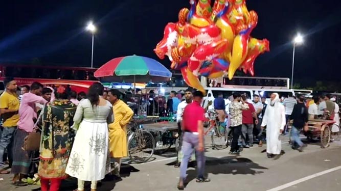 সত্যজিৎ ঘোষ, শরীয়তপুর থেকে : ঈদের তৃতীয় দিন গতকাল মঙ্গলবারও পদ্মা সেতুর শরীয়তপুরের জাজিরা প্রান্তে মানুষের ঢল নেমেছিল। রাতে সেতু দেখতে আসা মানুষের ভিড় বাড়তে থাকে। জাজিরা প্রান্তের টোল প্লাজার সামনে, সংযোগ সড়কের পাশে নানা পণ্যের পসরা সাজিয়ে বসেন দোকানিরা। ক্রেতা–বিক্রেতার উপস্থিতিতে সেখানে মেলার আমেজ তৈরি হয়।