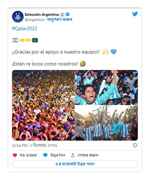 উল্লেখ্য, গত বুধবার পোল্যান্ডের বিপক্ষে গ্রুপ পর্বের ‘বাঁচা-মরার’ ম্যাচ ২-০ গোলে জিতে শেষ ষোলো নিশ্চিত করেছে আর্জেন্টিনা। পরদিনই আর্জেন্টিনা জাতীয় দলের অফিসিয়াল টুইটার অ্যাকাউন্টে বাংলাদেশের মানুষের উচ্ছ্বাসের তিনটি ছবি পোস্ট করা হয়। ক্যাপশনে ছিল আর্জেন্টিনা ও বাংলাদেশের পতাকার মাঝে ‘ফিস্ট বাম্পের’ ইমোজি। ক্যাপশনে লেখা হয়— ‘আমাদের দলকে সমর্থন করার জন্য ধন্যবাদ। তারা আমাদের মতোই পাগল।’