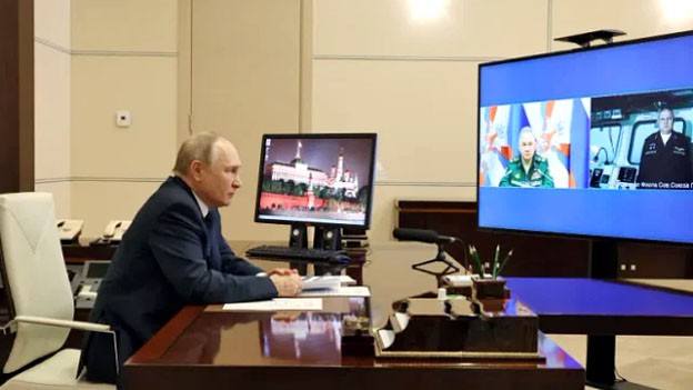 রাশিয়ার প্রেসিডেন্ট ভ্লাদিমির পুতিন বুধবার ভিডিও কনফারেন্সের মাধ্যমে হাইপারসনিক ক্রুজ ক্ষেপণাস্ত্রে সজ্জিত যুদ্ধজাহাজের যাত্রা শুরু উপলক্ষে আয়োজিত অনুষ্ঠানে যোগ দেন । ছবি: রয়টার্স
